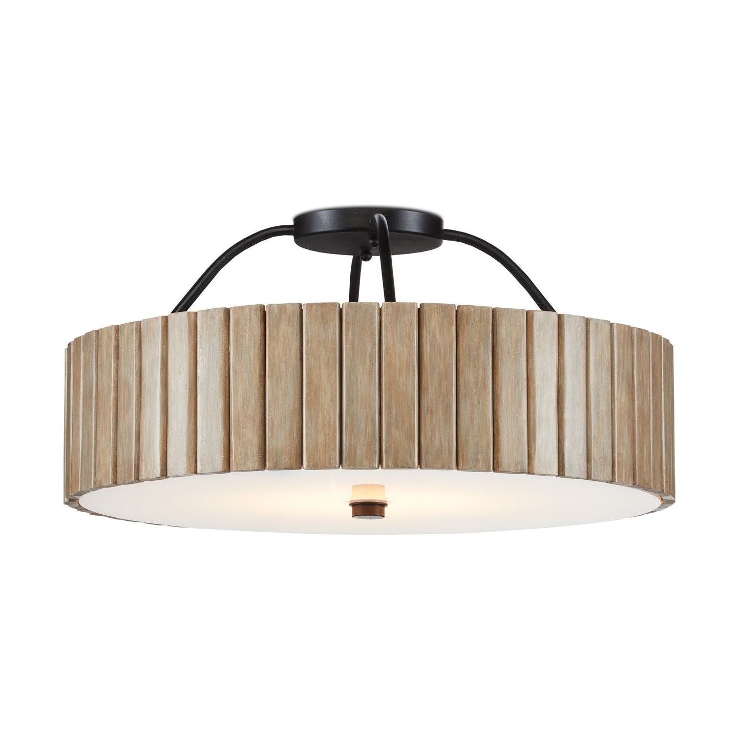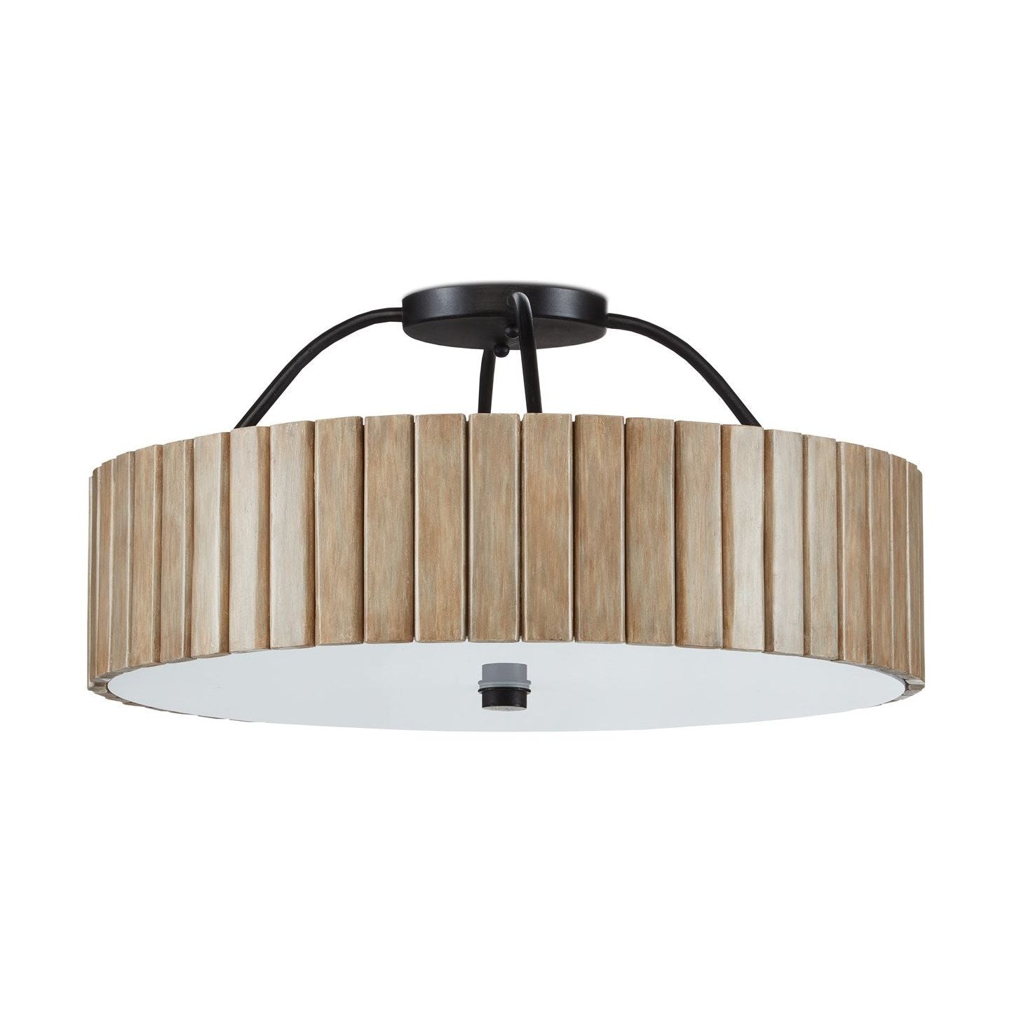 The Tetterby Semi-Flush Mount captures the beauty of sustainable materials and natural texture, bringing modern ease to any space. Designed by Tom Caldwell, this piece is crafted from natural bamboo in a soft taupe finish with a whitewashed effect. The contrast between the light-toned bamboo and blacksmith-finished metal detailing adds a subtle sophistication to its design.