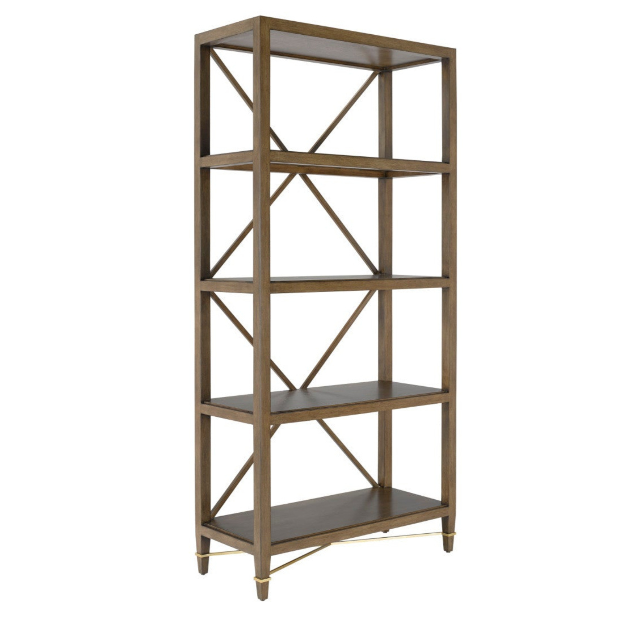 Crafted of mahogany in a woodland-inspired Chanterelle finish, the Verona Chanterelle Étagère combines warmth with refined design. The tall, narrow silhouette features elegant metal stretchers in a champagne finish, lending a touch of shimmer and architectural character.
